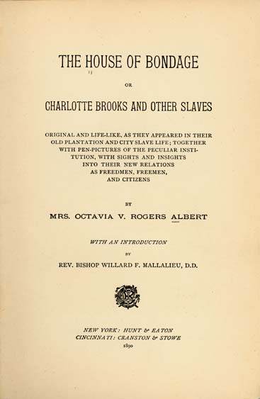 Albert, Octavia V. Rogers. "The House of Bondage, or, Charolotte Brooks and Other Slaves, Original and Life Like; Together with Pen-Pictures of the Pecuiliar Instituions, with Sights and Insights into Their New Relations as Freedmen, Freemen, and Citizens." New York: Hunt & Eaton, 1890. Google Books. Web. 12 Aug. 2019. <https://books.google.com/books?id=JdESAAAAYAAJ&ie=ISO-8859-1>.