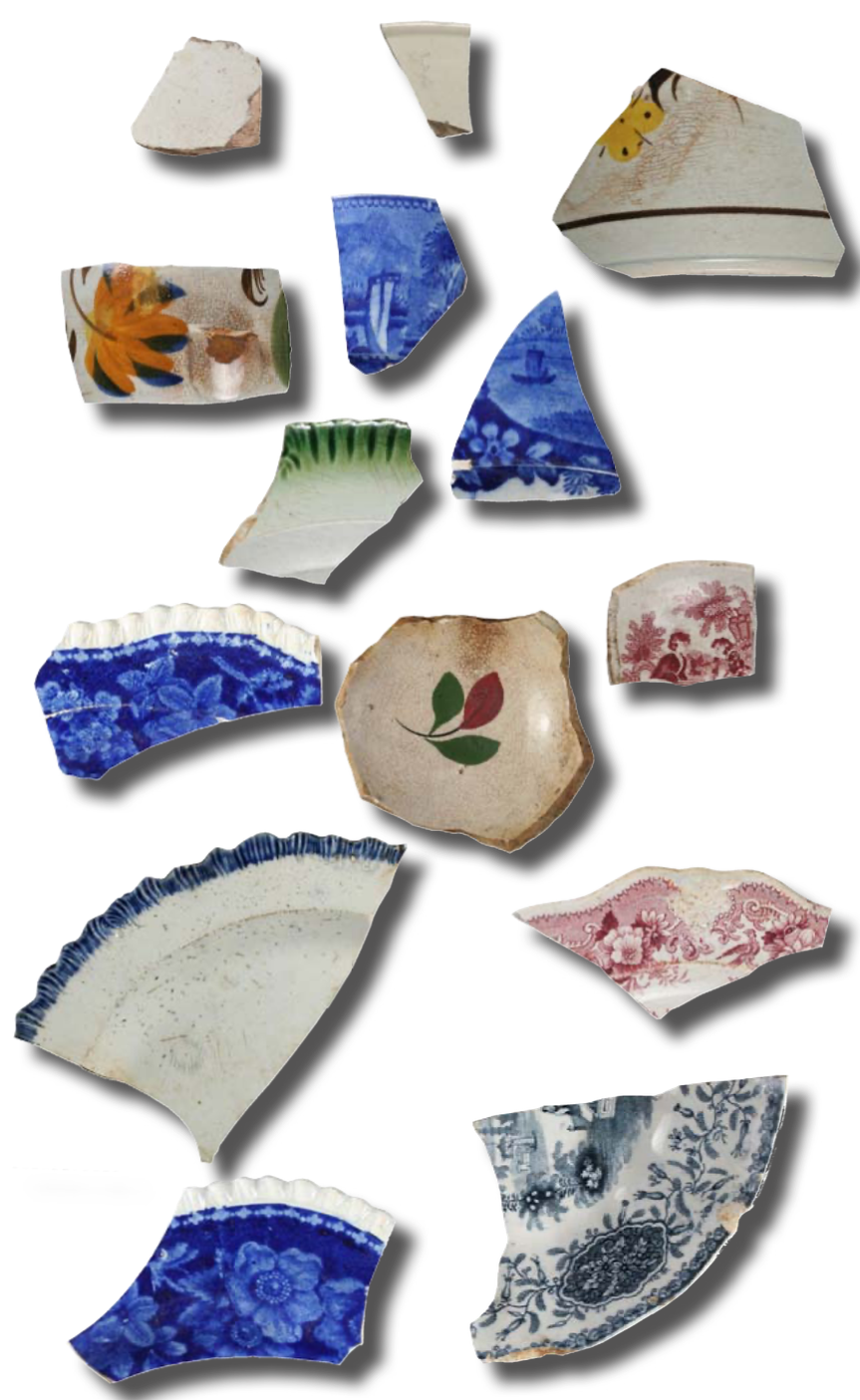 To be considered an archaeological site, a location must contain artifacts or features. An artifact is anything small that was made or used by people, such as an arrowhead, a clay pot, or a glass bottle. A feature typically is larger than an artifact and represents the remnants of something built by humans, such as a building or an Indian mound. At Bayou Sara, archaeologists uncovered features such as brick piers, cisterns, and trash deposits. They also recovered artifacts such as fragments of plates, bowls, cups, bottles, and other items used by the people who once lived in the town.