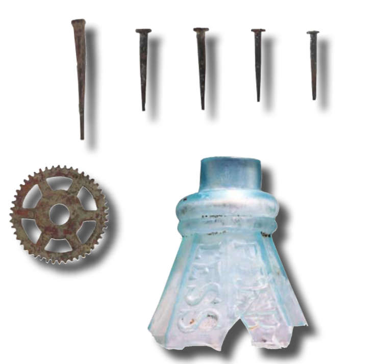 The deepest occupation layer in this test unit dated to the early and middle 1900s. It contained dish and bottle fragments made from the 1830s through the 1970s, including a ball clay marble and a clear machine-made soda bottle. Above this midden was an old ground surface that contained artifacts of a similar age. These included brick, coal, and metal fragments plus a machine-made jar. The items in both these layers were likely discarded by the Kaufman family. Sealing these layers was a thick layer of yellow alluvium deposited by the almost annual floods, which occurred from the 1970s through 2017.