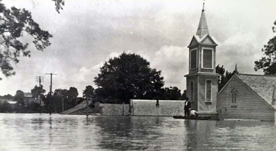 Bayou Sara flooded repeatedly, especially in 1844, 1846, and 1849, despite being surrounded by an earthen ring levee since the late 1820s. In May 1865, the batture area from Tunica Landing to Bayou Sara went under water. In May 1874, most buildings were inundated with from six to 24 inches, while in April 1882, all but two houses were submerged. The floods of 1890 and 1892 surpassed all previous floods in magnitude and scope. Water depths in 1890 ranged from two to seven feet, and not a single dwelling or other structure was spared. In 1892, a break in the bayou levee flooded the town with four to 11 feet of water, which did not drain away for almost a month. Although the town soon constructed new levees, some residents moved to St. Francisville and the safety of the bluffs. The Methodist Church did likewise in 1898.