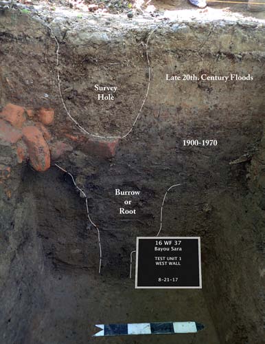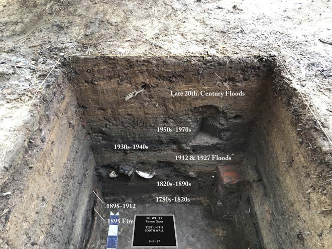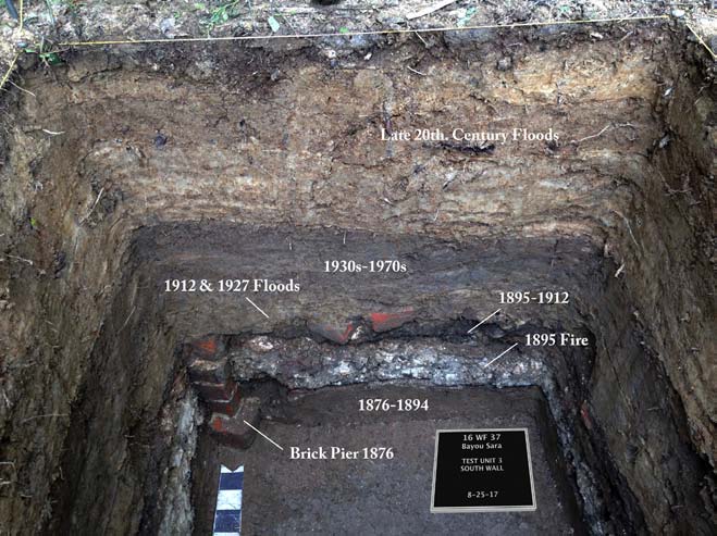 The work conducted at Bayou Sara between 2015 and 2017 constitutes the only archaeological investigation conducted in the former town of Bayou Sara, once the most important flatboat and steamboat port between Natchez and New Orleans. The archaeological excavations showed that remains of the town of Bayou Sara still exist and exactly how deeply they are buried. They also determined how much of the town has been lost to erosion. The excavators found the locations of some lots and specific buildings and collected a sample of the kinds of artifacts used on those lots through time. Careful study of the soil layers even showed how some residents survived and rebuilt after disasters.