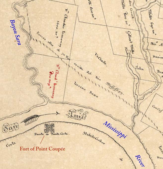 In 1787, the Spanish granted Jean Claude Trénonay de Chanfrey a tract of land at the mouth of Bayou Sara, which later passed to his nephew, Armand Duplantier. In 1799, John Smith and Reuben Kemper, of Cincinnati, Ohio, bought Duplantier’s property where they operated a store. When this partnership failed, Smith became the sole owner of the land where, in 1800, he laid out the town of New Valencia. Spanish Governor Carlos de Grand Pré bought four of the few lots sold in the town before the land passed to Smith’s sons. Once under American control, the town acquired the name of the bayou landing, and most of its street names were translated into English. Located on the batture of the Mississippi River at the mouth of the bayou, the town of Bayou Sara quickly developed into the most important flatboat and steamboat port between Natchez and New Orleans.
