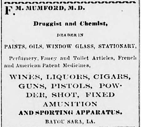 Bogel, another German immigrant, occupied the Lot 22 house and operated a drugstore there for three years before moving to Shreveport around 1870. Bogel rented the store and sold all the contents to Francis M. Mumford who was also a druggist. Although his father was a North Carolinian, Mumford was born in West Feliciana, served in the Confederate cavalry, and was postmaster in Bayou Sara from 1871 through 1893. In May 1875, an arsonist burned down Mumford’s drugstore plus a vacant store next door. Mumford lost the $7,000-building and $10,000 in stock, with insurance covering only $7,500. A few months later, Bogel sold Lot 22 to Lucien Martinez, a Cuban, who passed it to Conrad Bockel in 1876.