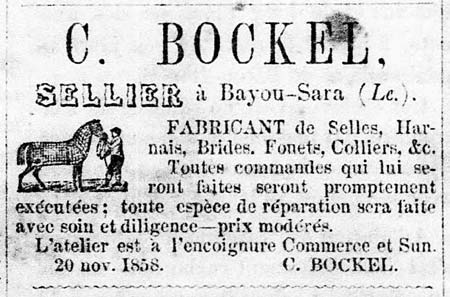 Russian by birth, Bockel moved to Bayou Sara from Texas in 1858 and bought the lot across Sun Street from Lot 22, from the heirs of Ellen Wooten. There he made saddles and harnesses. Between 1875 and 1882, he built a dry goods and grocery store on the corner of Lot 22, but the building was vacant by 1883. Bockel then built a livery, abutting the vacant store, between 1885 and 1891. Livery stables hired out mules, horses, wagons and carriages, stabled horses and mules for town residents, and also sold them. Bockel lost both properties in lawsuits with his creditors in 1885. However, his wife, Bridget, soon bought back both lots. While her father was Irish, Bridget Bockel and her mother were both born in Louisiana.