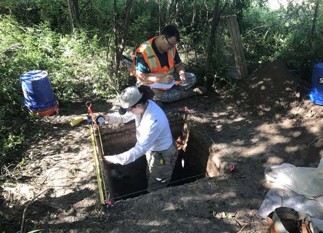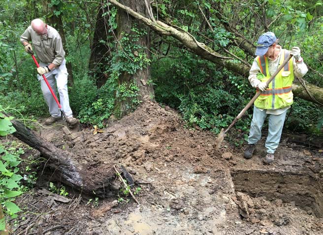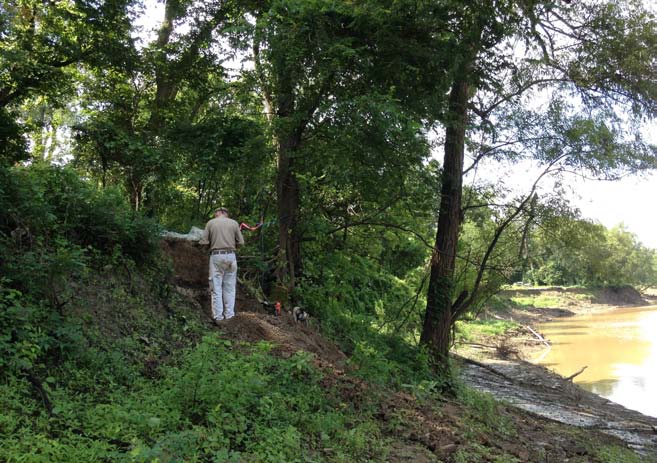 In the early 1980s, archaeologists working for the National Park Service used historic maps to find where the town of Bayou Sara used to be. Yet archaeologists would not examine the actual site for another 30 years. Before construction of rock and concrete facings to stabilize the east bank of the bayou, the Federal Emergency Management Agency (FEMA) hired archaeologists from Coastal Environments, Inc., to survey and dig shovel holes along the bank line in 2016. In 2017, they excavated four 1-by-1-meter test units next to the shovel tests that had contained artifacts or building remains.