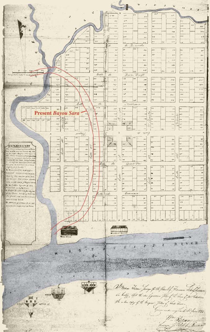 The French first mapped the small stream now known as Bayou Sara in the 1730s. They referred to it as the Riviere a la Chaude pissie, or “river of hot urine” perhaps due to its color and flow. Also colloquial for gonorrhea, Chaude pissie became Clap Creek under the British in the 1760s. By 1789, the bayou had acquired the more respectable name of Sara, reportedly after an elderly woman who then lived on its banks.