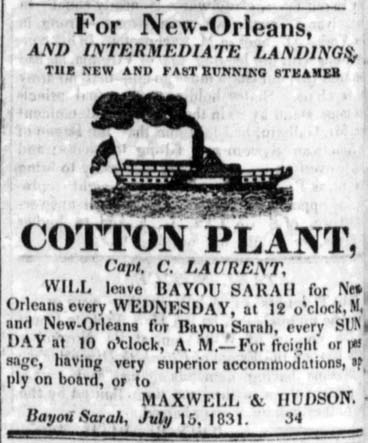 Bayou Sara, once the most important port for steamboats and flatboats between Natchez and New Orleans, is located on the Mississippi River, downhill from St. Francisville, in West Feliciana Parish, Louisiana. Named after the adjacent bayou, Bayou Sara was originally developed in 1800 and survived until the great flood of 1927. The town contained many homes and a wide variety of businesses, all of which were repeatedly rebuilt after many fires and floods.