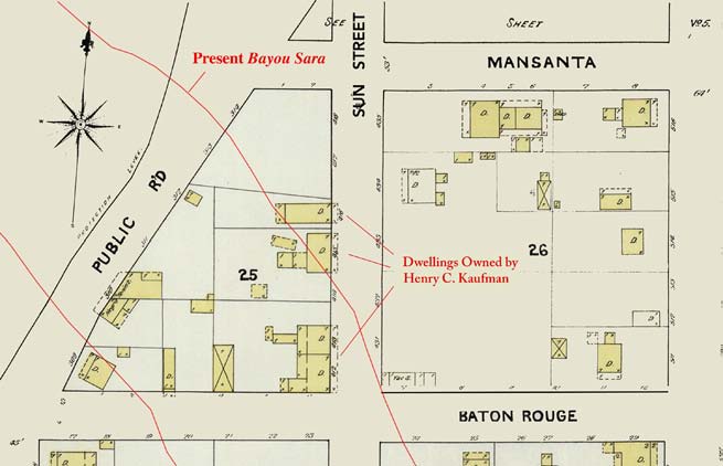 In 1895, both the store and livery on Lot 22 burned down in a fire that started across the street in the Bockels’ saddlery. Lot 22 then remained vacant and in the Bockel family until 1939 when it passed to a family friend, Charles T. Tooraen, Jr., the grandson of Swedish immigrant Charles E. Tooraen (see Lot 5 above). A chemical engineer in the Brazilian sugar industry, Tooraen sold the land to Paul Lambert in 1968. Bayou Sara began eroding away the northwestern corner of Lot 22 by 1988.