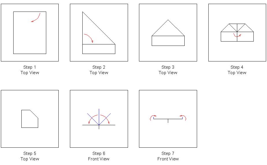 Step 2: Fold the left top corner down to the edge of the other side of the paper. Step 3: Fold the top angle down. Step 4: Fold the paper in half. Step 5: Fold both sides out leaving about 1/4 inch unfolded. Step 6: On both flat sides, fold up the ends of the paper. |