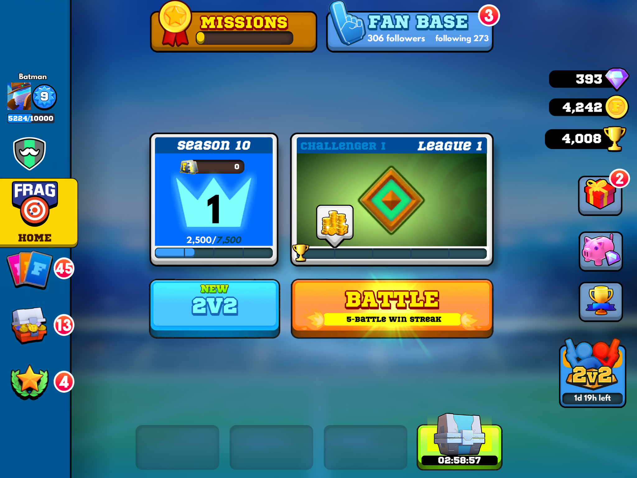 This is the main screen where you won't do much, but you do press battle or two v two to go into a fight. That's why it's the main screen. You also see certain challanges pop up from time to time, and you can check your missions and see what you have done.