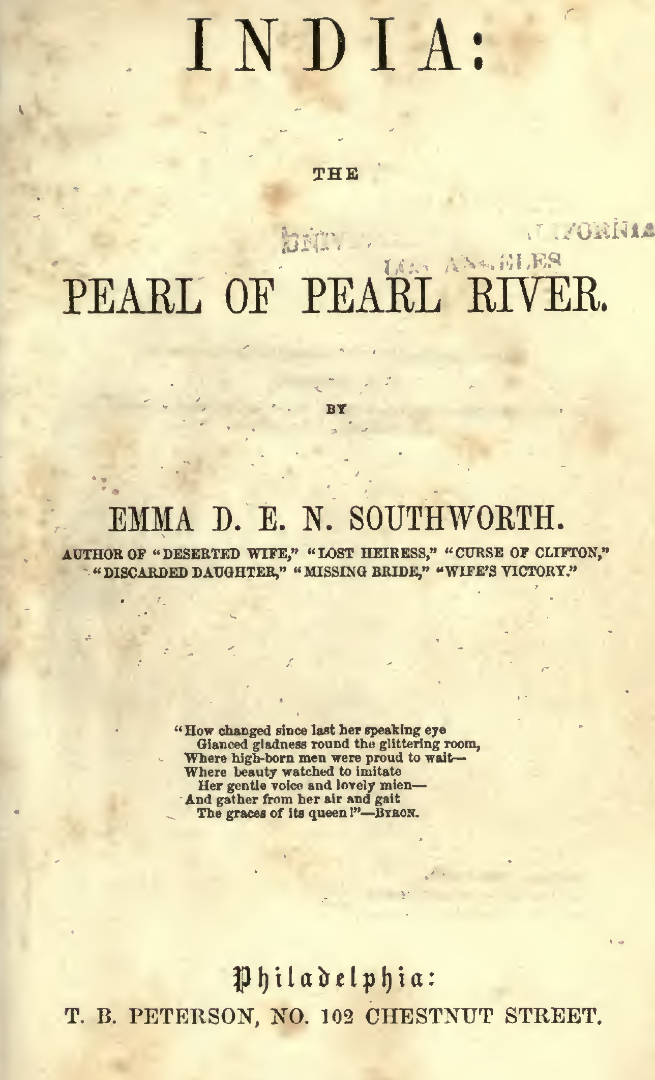 Southworth, Emma D. E. N. India: The Pearl of Pearl River. Philadelphia: T. B. Peterson, 1856, The Internet Archive, https:// archive.org/ details/ indiapearl ofpear00 soutiala, Accessed 26 Feb. 2025.