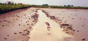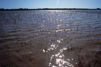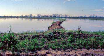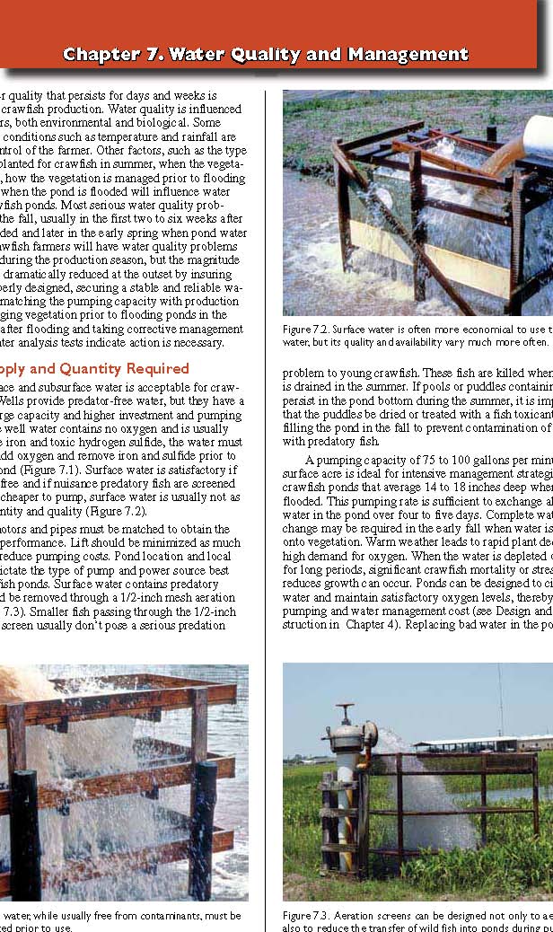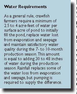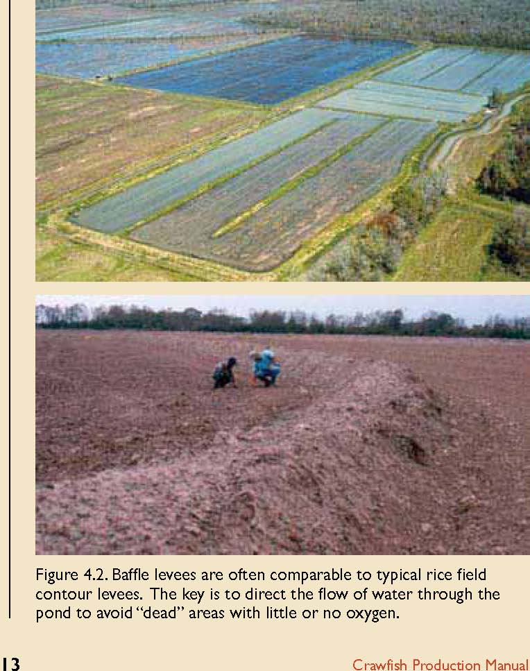 Crawfish are grown in shallow earthen ponds 8 to 24 inches deep. Relatively flat, easily drained land, with suitable levees, is required for production, harvesting and management of vegetation (Figure 3.1). Crawfish are cultured in areas where the soil has sufficient clay to hold water and accommodate bur-row construction. Water requirements for crawfish production are similar to those for other freshwater aquaculture ventures, with the possible exception of water quantity. Ponds are flooded in the fall and drained in the spring, and because of the oxygen demand from decaying vegetation, additional water exchanges are sometimes necessary.