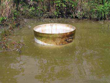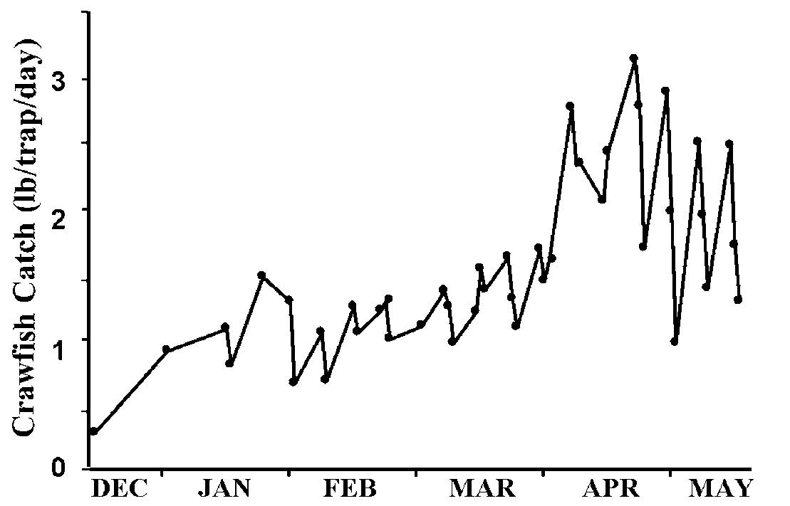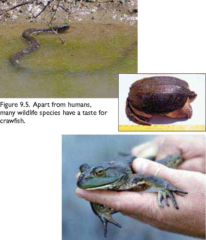 Crawfish of all ages and sizes, whether mature or immature and male or female, will dig or retreat to burrows to survive periods of dewatering. Crawfish ponds are usually drained during the summer months to allow for planting and growth of vegetation. Prior to draining, some mature crawfish burrow near the waterline (Figure 2.3). As the water level drops, additional crawfish burrows appear lower on the levee and are sometimes found on the pond bottom; however, the burrows on the pond floor often contain a high percentage of non-reproductive crawfish, such as males and immature juveniles.