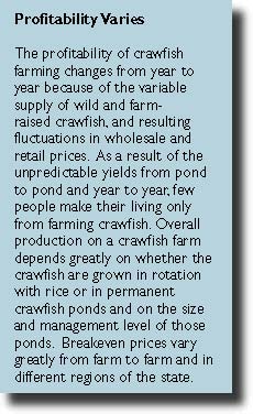 The profitability of crawfish farming changes from year to year because of the variable supply of wild and farm- raised crawfish, and resulting fluctuations in wholesale and retail prices. As a result of the unpredictable yields from pond to pond and year to year, few people make their living only from farming crawfish. Overall production on a crawfish farm depends greatly on whether the crawfish are grown in rotation with rice or in permanent crawfish ponds and on the size and management level of those ponds. Breakeven prices vary greatly from farm to farm and in different regions of the state.