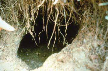 Several studies have provided more detail of crawfish burrows, but, in brief, crawfish cultured in Louisiana dig simple (unbranched), nearly vertical burrows, usually 40 inches or less in depth (Figure 2.6). Burrows serve as refuges from predators and provide moist or humid environments necessary for crawfish to survive through dry periods. Louisiana crawfish have evolved over millions of years to reproduce within the protection of their burrows. Most burrows are built at night and may require several days to complete. Crawfish burrows are usually dug by a single individual, and the burrow diameter is determined by the size of the crawfish. The burrow extends downward into a chamber slightly larger than the diameter of the tunnel.
