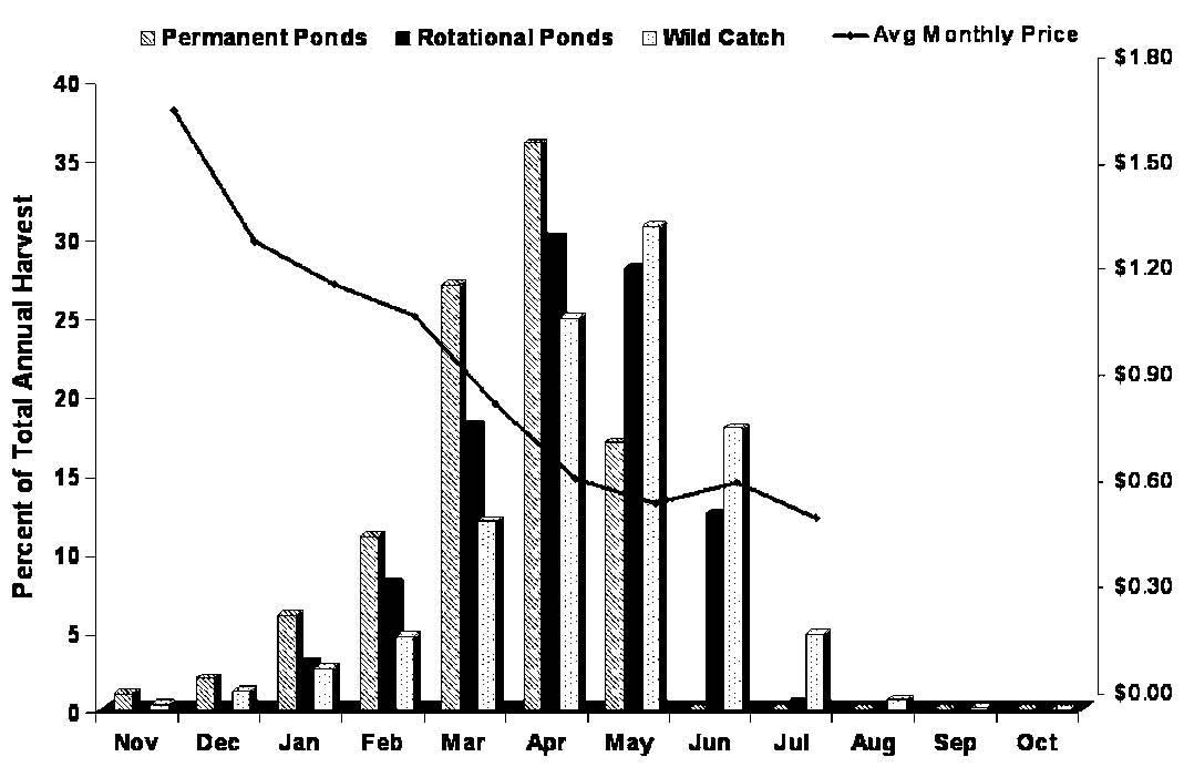 | Jul - Aug Sep - Oct Nov - Dec Jan - Feb Mar - Apr May - Jun July - . . . | Forage crop planted or natural vegetation allowed to grow Pond flooded and water quality monitored and managed Harvest when catch can be economically justified Crawfish harvested 2-4 days per week according to catch and markets Crawfish harvested 3-5 days per week according to catch and markets Crawfish harvested until catch is no longer justified; then pond drained Repeat cycle | Rice crop harvmanaged foPond flooded iquality monitorHarvest when justified Crawfish harveaccording to caCrawfish harveuntil late April, and readied forRice planted inmanaged for grRepeat cycle r re | ested in August and stubble n October and water ed and managed catch can be economically sted 2-4 days per week tch and markets sted 3-5 days per week then pond drained planting May and rice crop ain production growth | Rice crop harvested and stubble managed for regrowth Pond flooded in October and water quality monitored and managed Water quality monitored and managed Crawfish harvested 2-4 days per week according to catch and markets Crawfish harvested 3-5 days per week according to catch and markets Pond drained and soybeans planted or harvest proceeds as long as catch is feasible; pond then drained and left fallow Harvest soybeans in October, plant rice in March/April, stock crawfish in May, repeat cycle |