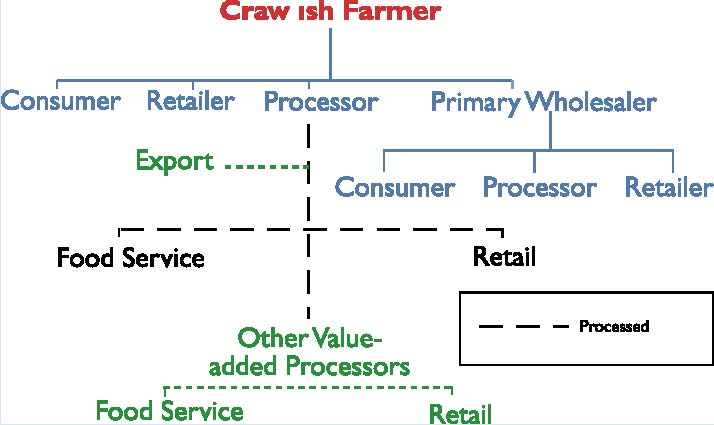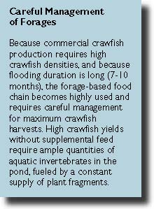 Supplemental feeds are not routinely provided to crawfish aquaculture ponds. Commercial culture of crawfish relies on a self-sustaining system for providing nourishment to crawfish, as occurs in natural habitats where crawfish are abundant. An established (or at least encouraged) vegetative forage crop provides the basis of a complex food web (Figure 2.11) that ultimately fuels production of crawfish with harvests that typically average 400-600 pounds per acre and can often exceed 1,000 pounds per acre.