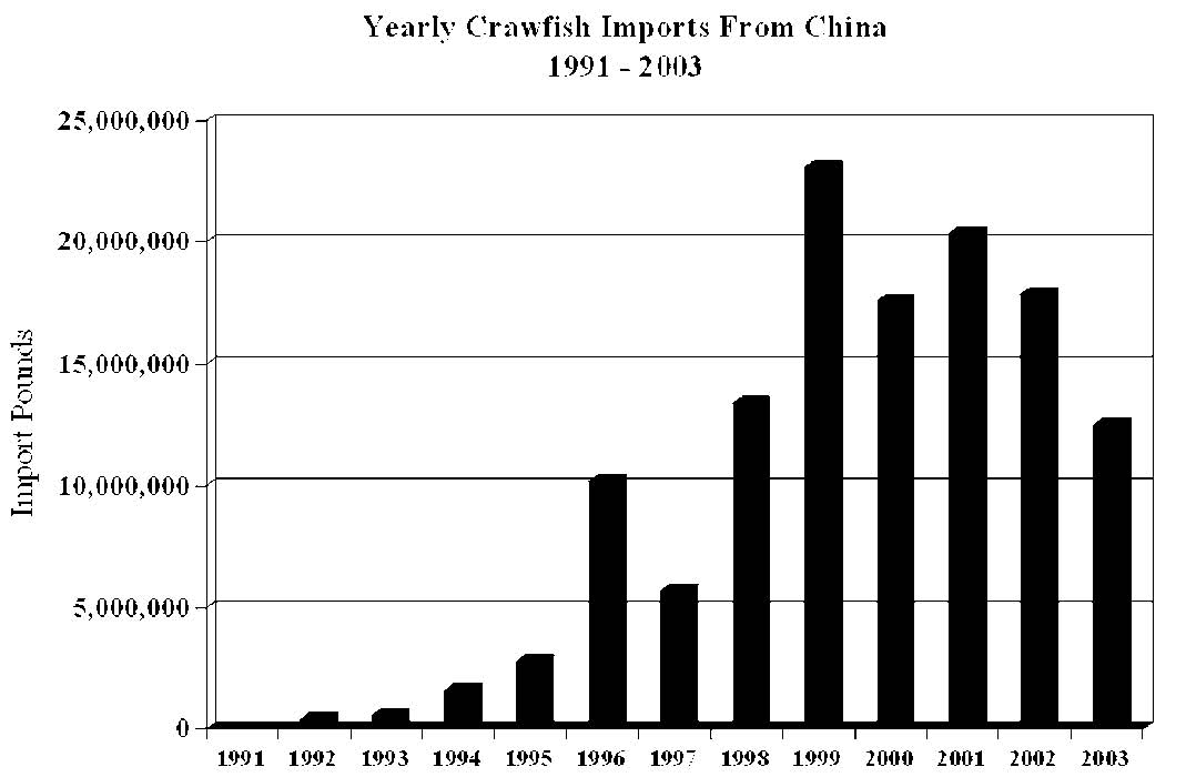 Louisiana's crawfish farming industry has grown to include more than 1,200 farms occupying more than 120,000 acres. Production from wild habitats, mainly the Atchafalaya River basin, varies from year to year. Total production for the 2004-2005 season was more than 82 million pounds, with almost 74 million pounds from farms and more than 8 million pounds harvested from natural habitats by approximately 1,100 fishermen. The farm-gate and dockside value of the 2004-2005 harvest exceeded $45 million.