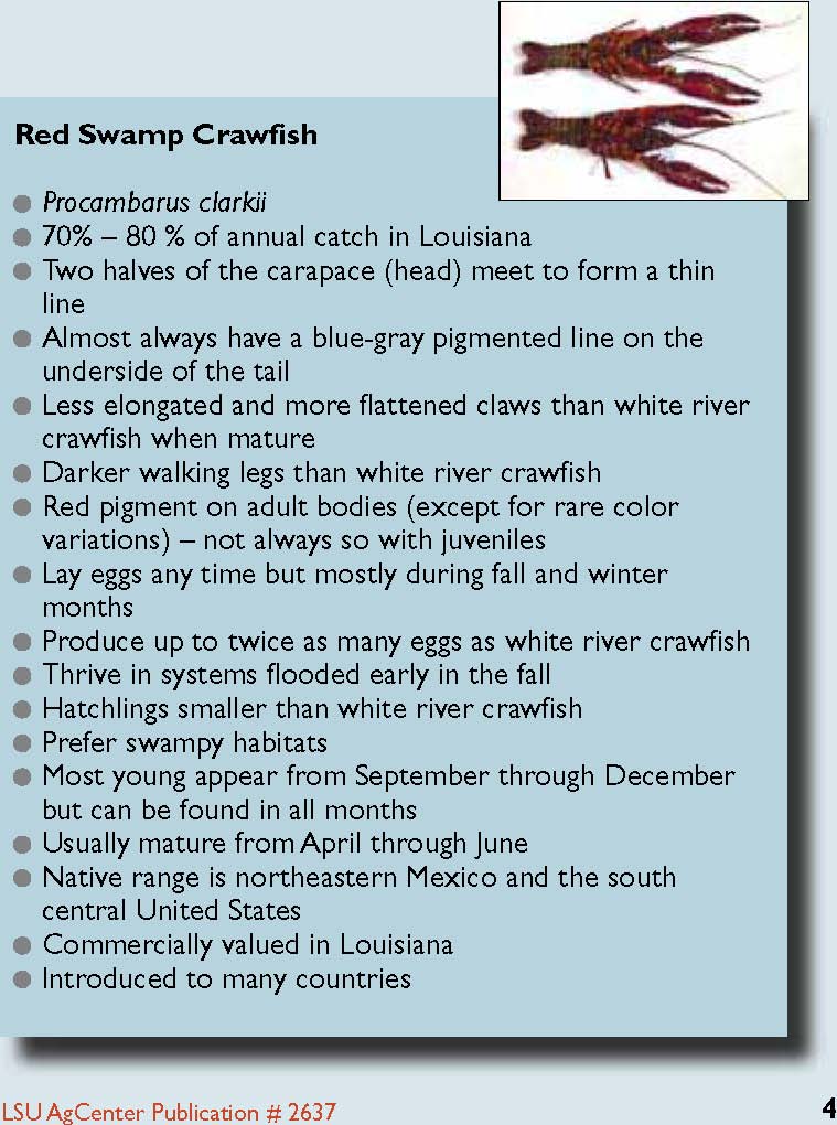 These two species are often similar in appearance, especially at a young age. They can be easily identified, however, by experienced persons. Despite efforts to exclude white river crawfish from many farms, both species will thrive under routine culture practices, and they often coexist in production ponds. No evidence exists of natural hybrids between these two species. Several books provide an excellent overview of the anatomy and biology of these and other crawfish species.