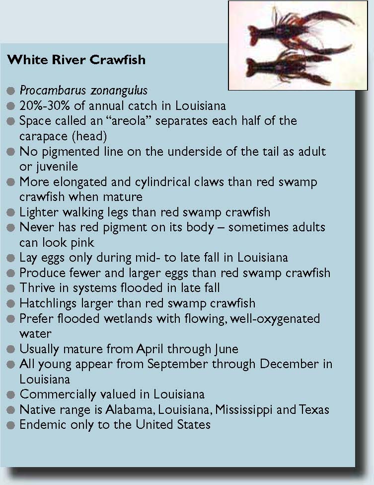 In general, both species are adapted to the conditions found in commercial crawfish ponds, and both respond well to the low input systems of production used in Louisiana. The abundance of one species or the other may vary among and within culture ponds over time, but the red swamp crawfish most often dominates and is the most desired species in the marketplace. White river crawfish are most often found in greatest numbers in ponds that are used to culture crawfish year after year.