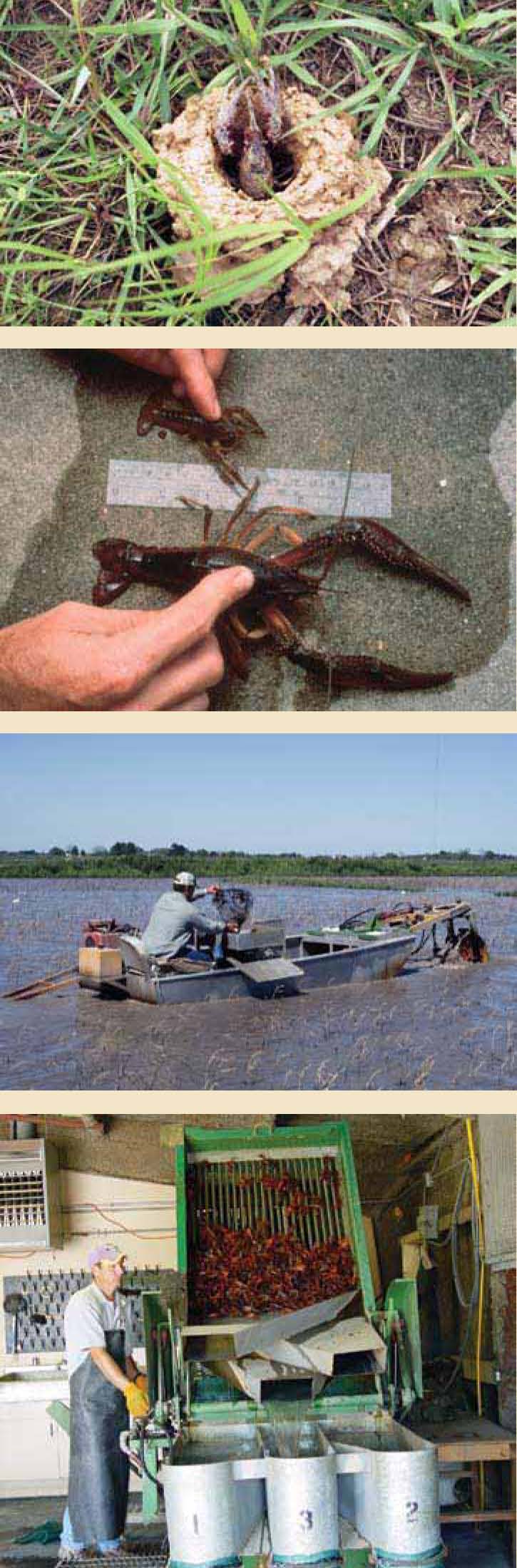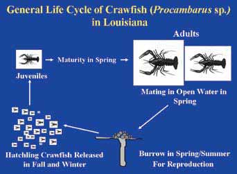 Red swamp and white river crawfish are naturally adapted to habitats with seasonal flooding and drying, where the dry period usually occurs from summer into autumn. The life cycle of crawfish is well suited to fluctuating periods of flooding and dewatering. In their natural, river or swamp habitats, sustained periods of river overflow permit crawfish to feed, grow and mature. Temporary dewatering, in both natural habitats and crawfish ponds, promotes aeration of bottom sediments, reduces abundance of aquatic predators and allows for establishment of vegetation that serves as cover for crawfish and the source of important food resources when water returns. Crawfish survive the dry intervals by digging or retreating to burrows where they can avoid predators, acquire moisture necessary for survival and reproduce in safety.
