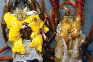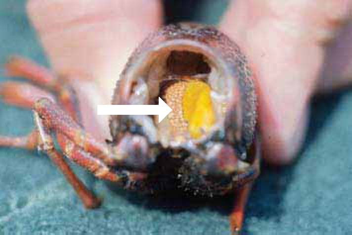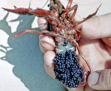Ovarian (egg) development in mature females is temperature dependent, usually beginning prior to burrowing and reaching completion within the burrow. Developing eggs within the ovary become rounded, increase in size, and change from a light color to dark as they mature (Figure 2.4). At maturity, the large black eggs are shed from between the walking legs, are fertilized externally and are then attached to the swimmerets on the underside of the tail with an adhesive substance called glair. Although crawfish can survive in high humidity within the burrow, some standing water is necessary for successful reproduction. The number of eggs laid varies with female size and condition, but large red swamp or white river crawfish females can have more than 500 eggs.