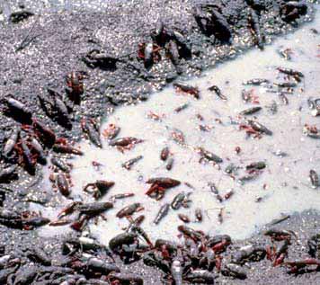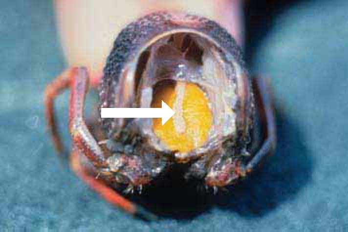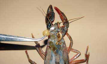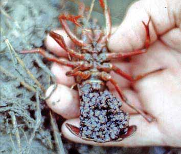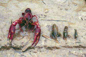 These crawfishes have life cycles that are well-adapted to farm production strategies (Figure 2.1). Mature animals mate in open water where sperm is stored in a special receptacle, after which the female retreats to a burrow to eventually spawn. Burrowing activity can occur at any time but is most prevalent in late spring/early summer in Louisiana. Although spawning can take place in open water, the burrow provides protection while the fertilized eggs or young are attached to the underside of their mother's tail (Figure 2.2). Females carrying eggs or hatchlings are highly susceptible to predators, because they cannot use their normal tail-flipping escape response.