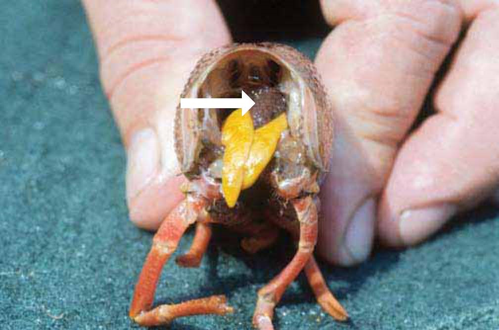 Molting is usually accomplished in minutes. The brittle exoskeleton splits between the carapace (head) and abdomen (tail) on the back side, and the crawfish usually withdraws by tail flipping. During the “soft” phase that follows, the soft exoskeleton expands to its new, larger dimensions. Hardening (calcification) of the new exoskeleton takes place during the post-molt period, which can be divided into two phases. Initial hardening occurs when calcium stores within the body are transported to the new exoskeleton. Calcium is stored in the body both in soft tissue and for a short period in two hard “stomach stones” or gastroliths (Figure 2.9) located in the head, on each side of the stomach. These stones disappear during the initial hardening period after molting. The second phase of hardening is by absorption of calcium from the water. As crawfish resume feeding, further hardening of the new shell occurs.