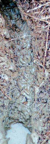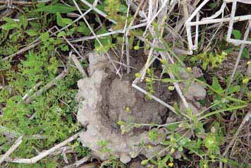 Water levels in burrows vary with the moisture conditions in the soil. Free water at the bottom of the burrow is more often associated with “trapped” water than the actual water table of the soil. Walls of the burrow and terminal chambers are extensively worked by the crawfish, possibly to ensure good seals. The terminal chamber normally contains wet slush when water is not present, which serves as a humidifier. The entrance of the completed burrow is eventually closed with a mud plug (Figure 2.7), sometimes having a chimney or stack of the soil removed during excavation. Burrow entrances at the water's edge are often associated with natural cover, such as vegetation or woody debris. Over the course of the summer, weathering and covering by vegetation may make the burrow entrance undetectable.