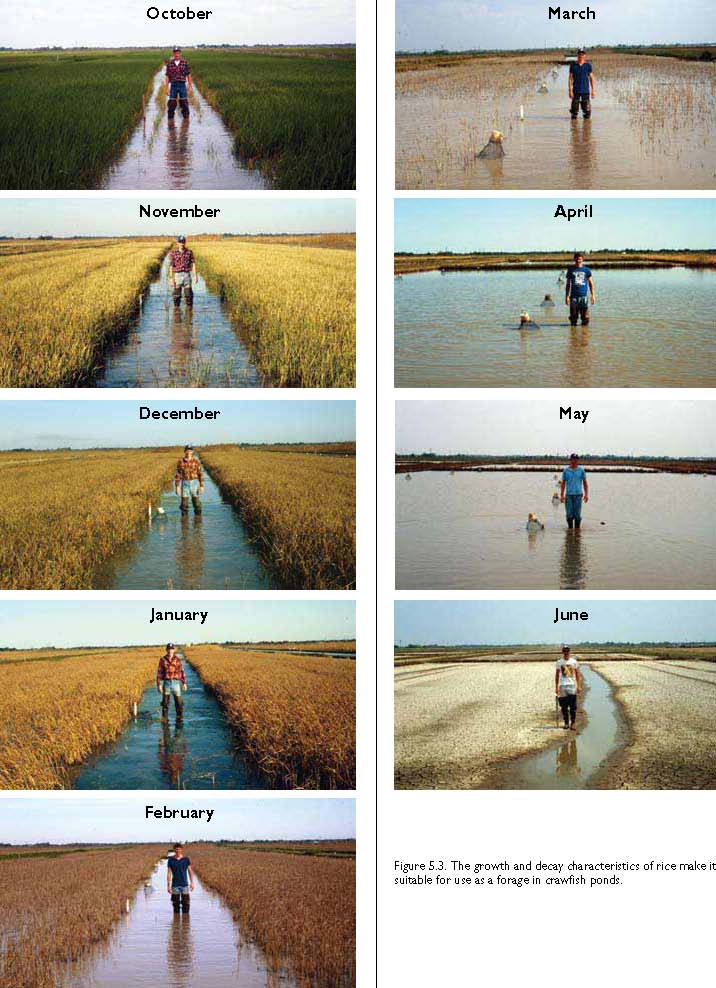 Plant fragments from the decomposing vegetation provide the “fuel” that drives a detrital-based production system, with crawfish at the top of the food web. As a result, the main means of providing nutrition to crawfish in aquaculture is through establishing and managing a forage crop. Ideally, once ponds are flooded in the fall, a constant and continuous supply of plant fragments fuels the food web from which crawfish derive their nutrition. (Also see chapter 5.)
