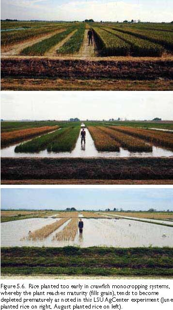 Crawfish monoculture or “single-crop” systems is the production method of choice for many small farms or where marginal lands are available and unsuited for other crops. Permanent ponds, or sites devoted to at least several consecutive production cycles, are typically used for this strategy. Pond size and production input for this approach range from large (greater than 300 acres) impounded wetlands with little management to small (less than 15 acres) intensively managed systems. The main advantage of a monocropping strategy is that producers can manage for maximum crawfish production without the various concerns associated with other crops, such as pesticide exposure, seasonal limitations and other constraints associated with crop rotation.