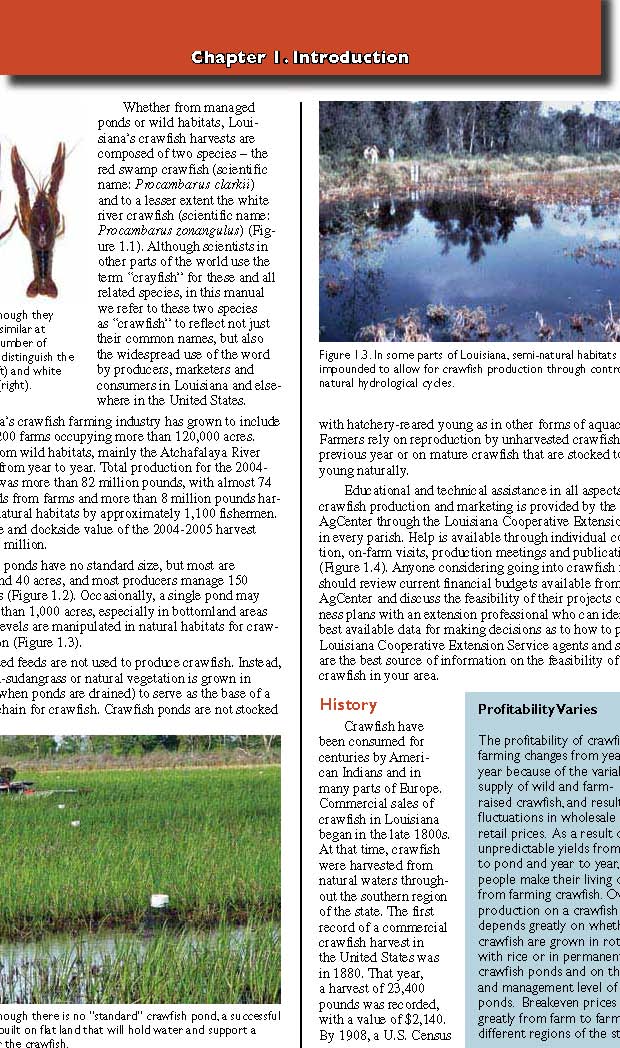 Whether from managed ponds or wild habitats, Louisiana's crawfish harvests are composed of two species – the red swamp crawfish (scientific name: Procambarus clarkii) and to a lesser extent the white river crawfish (scientific name: Procambarus zonangulus) (Figure 1.1). Although scientists in other parts of the world use the term “crayfish” for these and all related species, in this manual we refer to these two species as “crawfish” to reflect not just their common names, but also the widespread use of the word by producers, marketers and consumers in Louisiana and elsewhere in the United States.