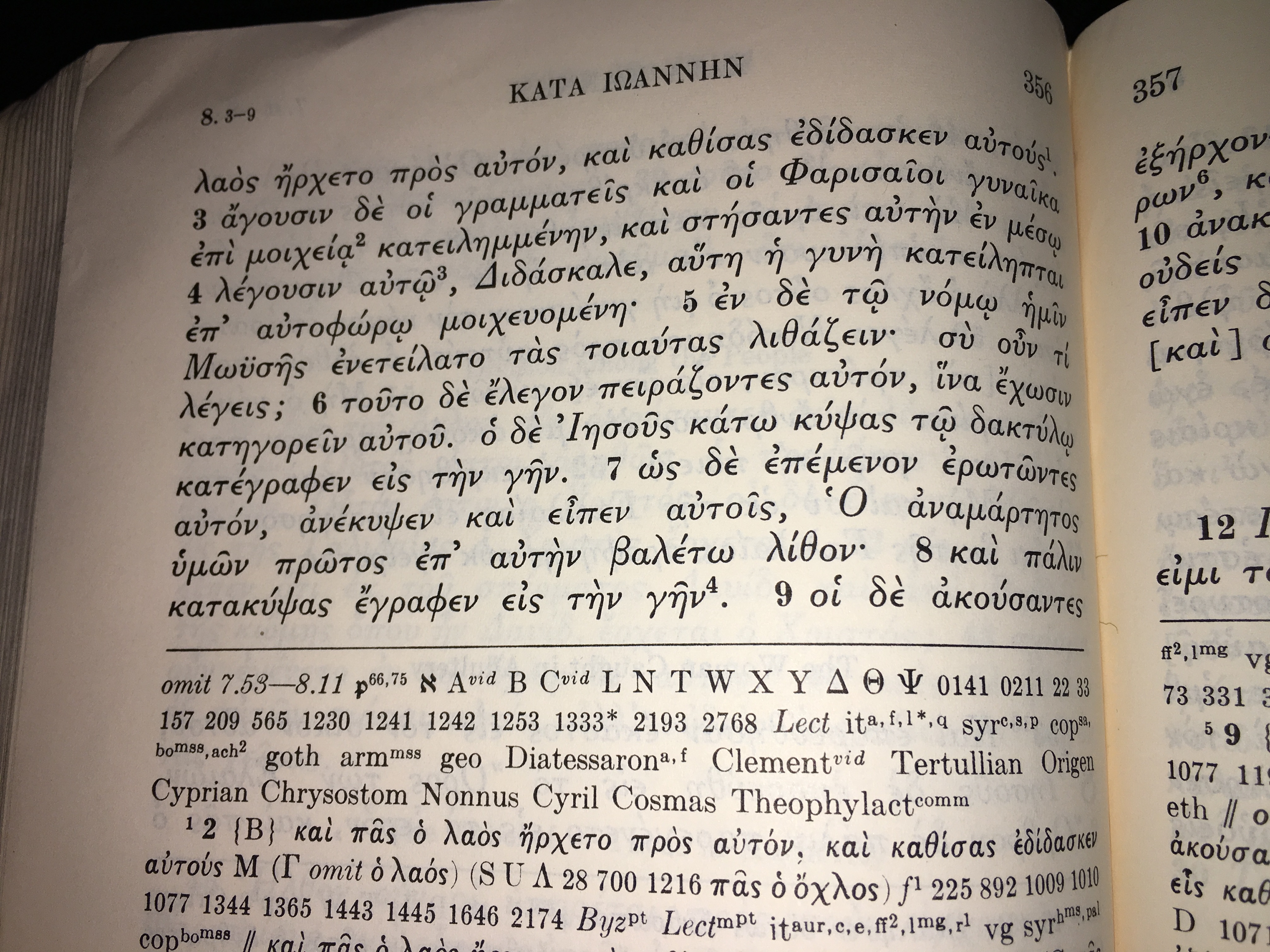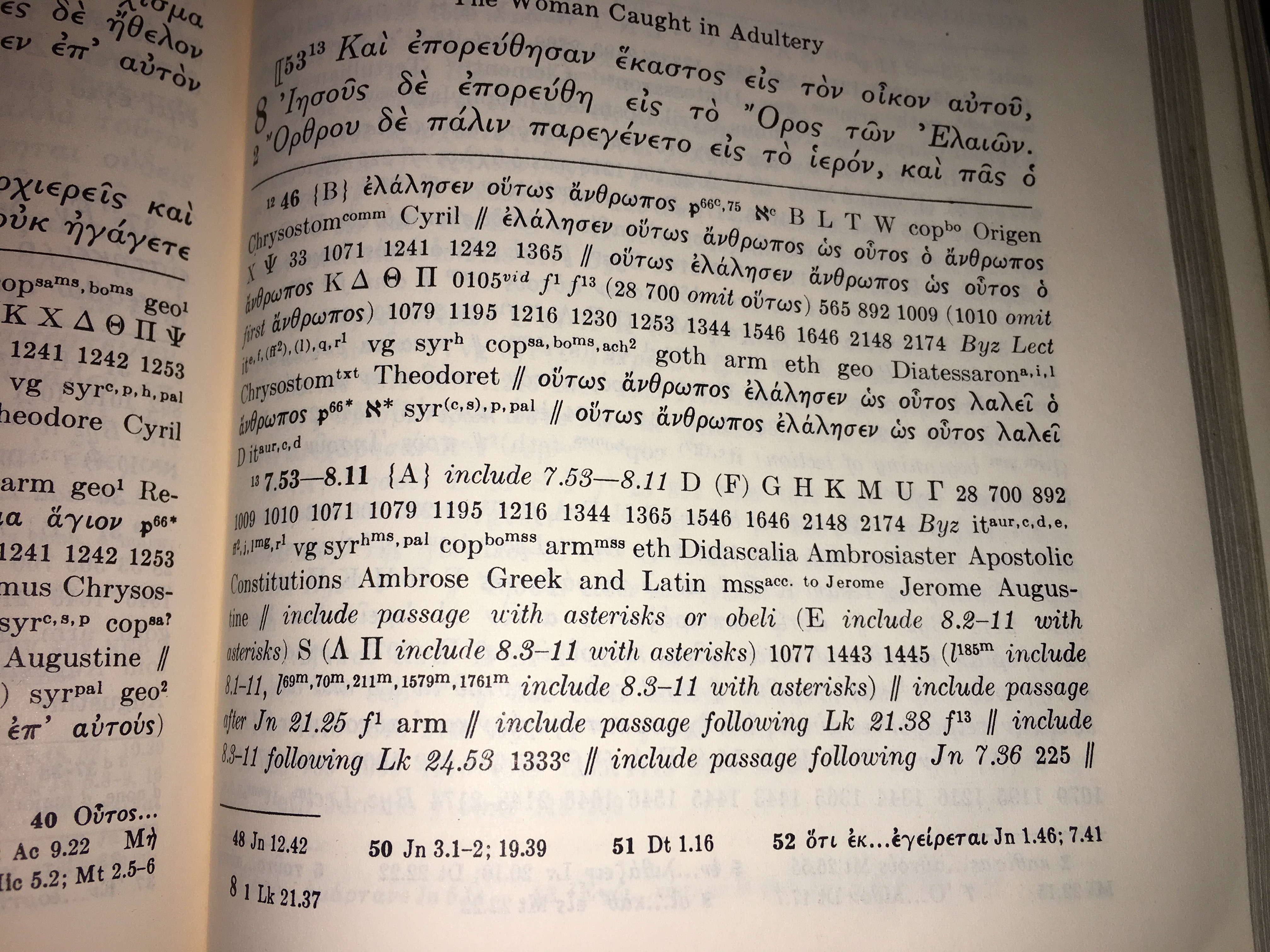 - 7:53-8:11] D (F lacuna 7:28-8:10) G H K M U Γ 28 180 205 579 597 700 892 1006 1009 1010 1071 1079 1195 1216 1243 1292 1342 1344 1365 (1424mg) 1505 1546 1646 2148 2174 Byz itaur itc itd ite itff2 itj itl(mg) itr1 vg syrp(mss)syrh(mss) syrpal copbo(pt) eth slavmss(mg) Didascalia Ambrosiaster Faustus-Milevis Apostolic Constitutionsvid Pacian Ambrose Rufinus Jerome Augustine mssaccording to Didymus Greek and Latin mssaccording to Jerome [[WH]] [[NA]] [NR] CEI ND Riv Dio TILC Nv