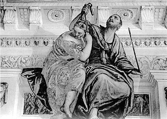 If the stories of Phyllis and Aristotle and the Wife of Bath invert the proper hierarchy, we can see the proper relationship in the painting "La Virtu che frena il Vizio" ("Virtue Restrains Vice") by Veronese.
