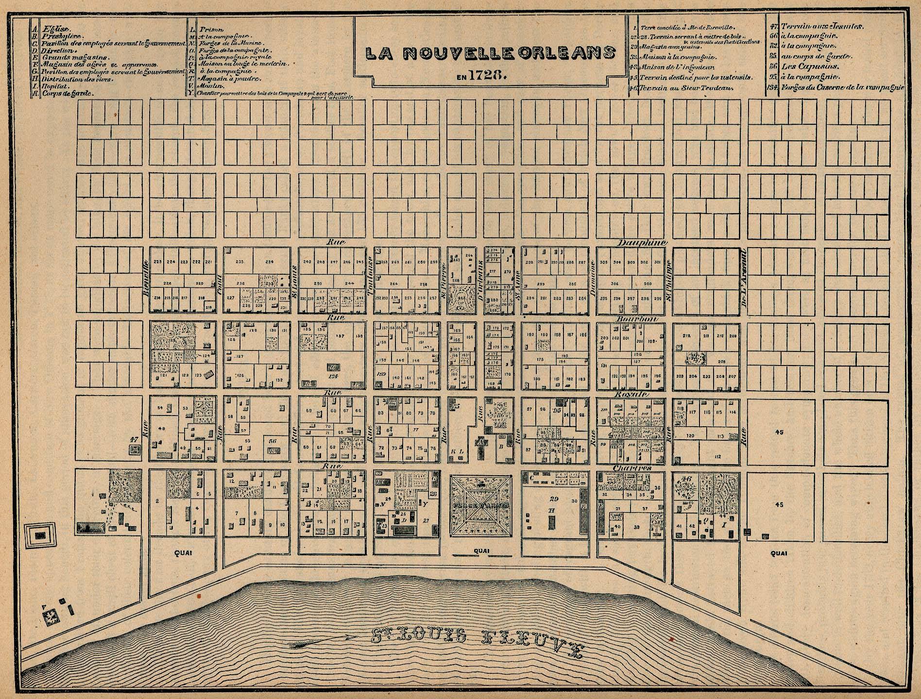 Bienville held a card: La Nouvelle Orléans, though prone to floods and illness, numbered 519 people by 1721. He awarded himself twenty-seven acres near the king’s plantation across the river, and cultivated an ally in Adrien de Pauger, a French engineer. Pauger had been bickering with his boss, chief royal engineer Louis-Pierre Le Blond de La Tour, down in Biloxi, where a faction wanted the d’Orléans port to be built. Pauger was sent up the Mississippi to see if they might do better north of Lake Pontchartrain at Bayou Manchac. At Bienville’s site, gazing at the few riverfront cabins and clumps of trees, Pauger envisioned a city. He designed a grid of sixty-six squares, eleven parallel to the river, six on perpendicular lines. A roof and a garden were “necessities of urban life,” Pauger wrote La Tour. Bienville, who built a large house below the riverfront clearance, provided Pauger with land and slaves.