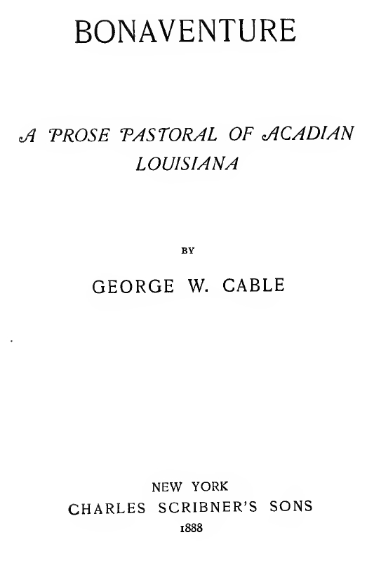 Cable, George Washington. Bonaventure: A Prose Pastoral of Acadian Louisiana. New York: Charles Scribner's Sons, 1888. Internet Archive. 9 Nov. 2007. Web. 21 Apr. 2014. <https:// archive.org/ details/ bonaventure apro00 conggoog>.