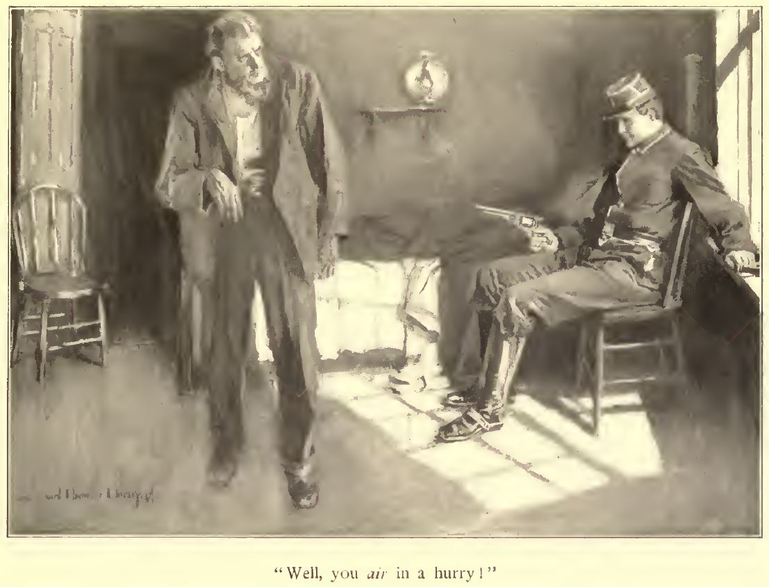 Gholson’s lips moved inaudibly, his jaws set hard, and he blanched; but the Colonel smiled once more: “I’ve heard that at one time you said, or implied, that Captain Ferry had betrayed his office, because when he had a fair chance to shoot this varmint he omitted, for private reasons, to do it. And I’ve heard you say, myself, that this isn’t your own little private war. So, — just change seats with me.”