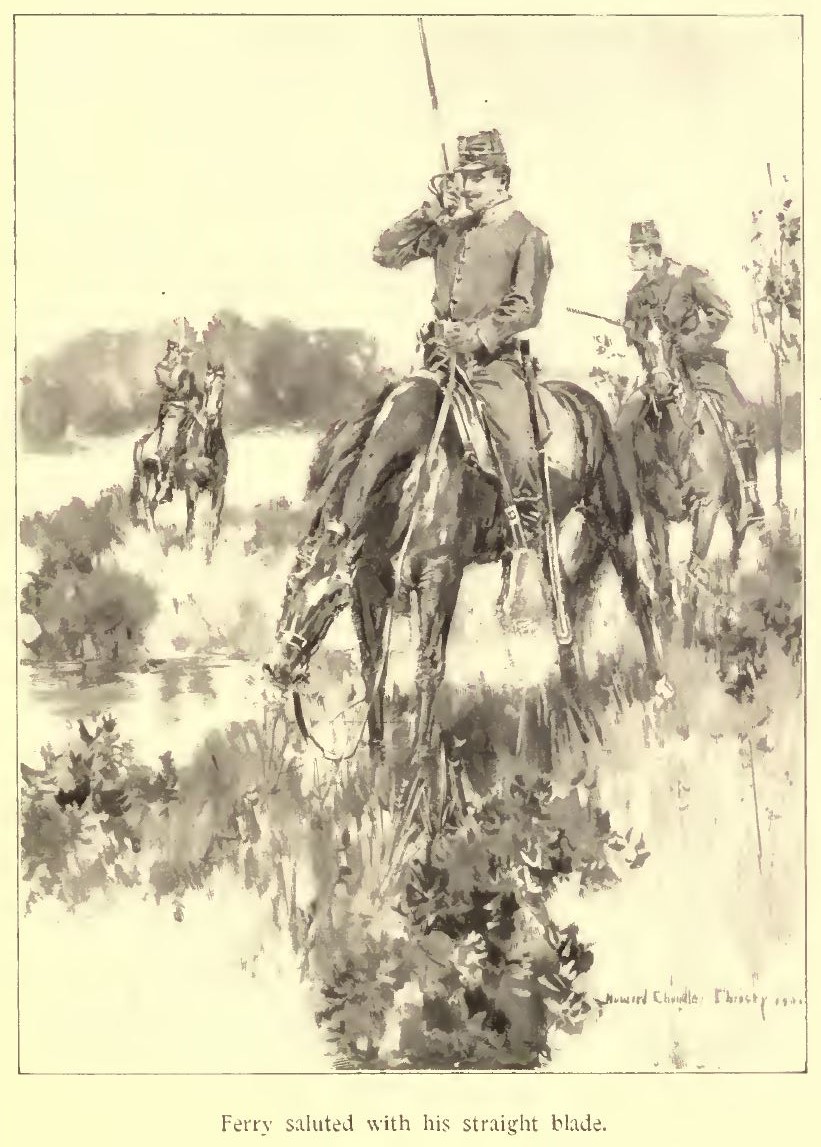 However, there came a change. By mid-forenoon our gaiety ran on only by its momentum. The wedding was to be at eleven. At ten the Colonel, aside, told me, with a ferocious scowl, that my Captain ought to have arrived. At half-past he told me again, but Major Harper, returning from Hazlehurst, said, “Oh, any of a hundred trifles might have delayed him a short time; he would be along.” The wedding-hour passed, the wedding-feast filled the air with good smells. Horsemen ambled a few miles up the road and came back without tidings. Then a courier, one of Ferry’s scouts, galloped up to the General’s tent, and presently the Major walked from it to the tavern and up to Charlotte’s room, to say that Ferry was only detained by Quinn’s non-arrival. “It’s all right,” said everyone.