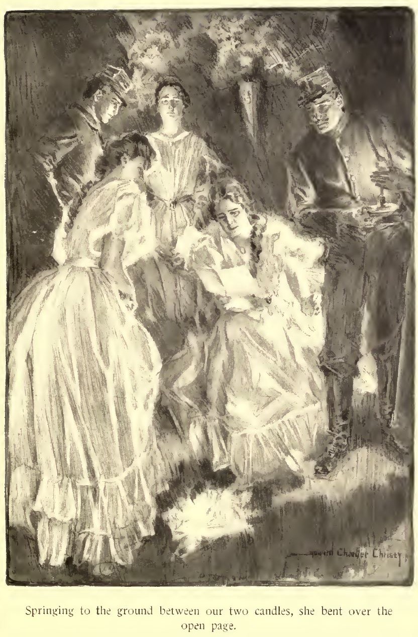 - Springing to the ground between our two candles, she bent over the open page