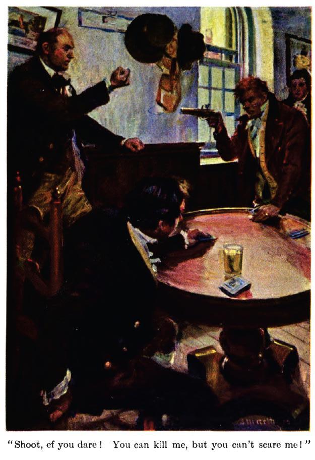 “I did not, saw! I given you no cause of offence, saw! It’s not so, saw! Mister Jools simply mistaken the house, thinkin’ it was a Sabbath-school! No such thing, saw; I ain’t bound to bet! Yes, I kin git out. Yes, without bettin’! I hev a right to my opinion; I reckon I’m a white man, saw! No saw! I on’y said I didn’t think you could get the game on them cards. ’Sno such thing, saw! I do not know how to play! I wouldn’t hev a roscal’s money ef I should win it! Shoot, ef you dare! You can kill me, but you cayn’t scare me! No, I shayn’t bet! I’ll die first! Yes, saw; Mr. Jools can bet for me if he admires to; I ain’t his mostah.”