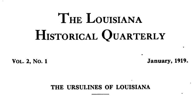 Cruzat, Heloise Hulse. “The Ursulines of Louisiana.” Louisiana Historical Quarterly 2.1 (1919): 5-23. Google Books. Web. 17 Nov. 2015. <https:// books.google. com/ books?id= dFoTAAAAYAAJ>.