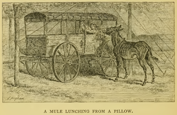 My husband rolled his overcoat for my pillow, telling me that a soldier slept like a top with such an one, and it was much better than a saddle, in the hollow of which he had often laid his flaxen top-knot. But a woman cannot make herself into a good soldier all in a minute. If one takes hold of the thick, unwieldy material that Uncle Sam puts into the army overcoat, some idea can be gained of the rocky roll it makes when doing duty as a resting-place; and anyone whose neck has made the steep incline from head to shoulder that this substitute for a pillow necessitates, is apt to waken less patriotic than when he retired. After repeated efforts to get accustomed to this, buoyed up by my husband’s praise of my veteran-like behavior, I confided to Eliza that I should not be ungrateful for any device she might think out for my relief, if she would promise not to tell that I had spoken to her. The next day she gathered moss from the trees along the stream, and I felt that I could serve my country just as well by resting on this soft bed. I had begged off from using a tent in that country, as there seemed to be no insect that was not poisonous, and even many of the vines and underbrush were dangerous to touch. My husband had the wagon placed in front of the tent every night when our march was ended, and lifted me in and out of the high sleeping-room, where I felt that nothing venomous could climb up and sting. The moss, though very comfortable, often held in its meshes the horned toad, a harmless little mottled creature that had two tiny horns, which it turned from side to side in the gravest, most knowing sort of way. The officers sent these little creatures home by mail as curiosities, and, true to their well-known indifference to air, they jumped out of the box at the journey’s end in just the same active manner that they had hopped about under our feet. Still, harmless as they were held to be, they were not exactly my choice as bed-fellows, any more than the lizards the Texans call swifts, which also haunted the tangles of the moss. Eliza tried to shake out and beat it thoroughly, in order to dislodge any inhabitants, before making my bed. One night I found that hay had been substituted, and felt myself rich in luxury. I remembered gladly that hay was so clean, so free from all natural history, and closed my eyes in gratitude. And then it smelt so good, so much better than the damp, vegetable odor of the moss. A smudge at the end of the wagon was rising about me to drive away mosquitoes, and though the smoke scalds the eyes in this heroic remedy, I still comforted myself with the fresh odor of the hay, and quietly thought that life in a manger was not the worst fate that could come to one. All this pervading sense of comfort was slightly disturbed in the night, when I was awakened by a munching and crunching at my ear. Wisps of hay were lying over the side of the wagon, as it was too warm to leave the curtains down, and the attraction proved too much for a stray mule, which was quietly eating the pillow from under my head. It was well our tent and wagon were placed to one side, quite off by themselves, for the General would have waked the camp with his peals of laughter at my indignation and momentary fright. It did not need much persuasion to rout the mule after all the hubbub my husband made with his merriment, but I found that I inclined to the moss bed after that.