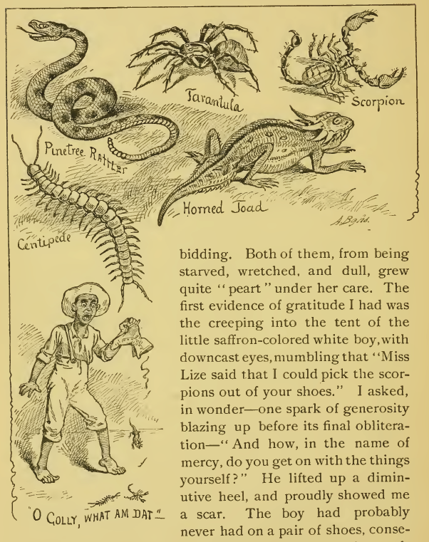 Eliza has been reminding me of our daily terror of the creeping, venomous enemy of those hot lands. She says, “One day, Miss Libbie, I got a bite, and I squalled out to the Ginnel, ‘Somethin’s bit me!’ The Ginnel, he said, ‘Bit you! bit you whar?’ I says, ‘On my arm;’ and, Miss Libbie, it was pizen, for my arm it just swelled enormous and got all up in lumps. Then it pained me so the Ginnel stopped a-laughin’ and sent for the doctor, and he giv’ me a drink of whiskey. Then what do you think! when I got better, didn’t he go and say I was playin’ off on him, just to get a big drink of whiskey? But I ’clar’ to you, Miss Libbie, I was bad off that night. The centipede had crept into my bedclothes, and got a good chance at me, I can tell you.”