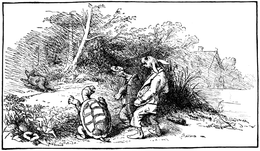 One day, quite early, Compair Lapin arose, and he felt hunger gaining upon him. He looked everywhere in the cabin; he found nothing to eat. He ran towards Compair Bouki. When he arrived, he saw Compair Bouki, who was gnawing a bone. — Eh! Compair Bouki, I had come to take breakfast with you; but I see that you don’t have anything famous to give me. — Times are hard, Compair Lapin; there are no more rations in the cabin; only this bone left. Compair Lapin reflected a little. — Well! Compair Bouki, if you wish, we shall go hunting for the eggs of the tortoise. — Agreed upon! let us go right off. Compair Bouki took his basket and the hoe, and they started towards the bayou in the woods. — Compair Lapin, I don’t often go hunting for tortoise eggs; I don’t know well how to find them. — Don’t trouble yourself, Compair Bouki, I find all the time a place where tortoises lay their eggs. You, you will dig them up.