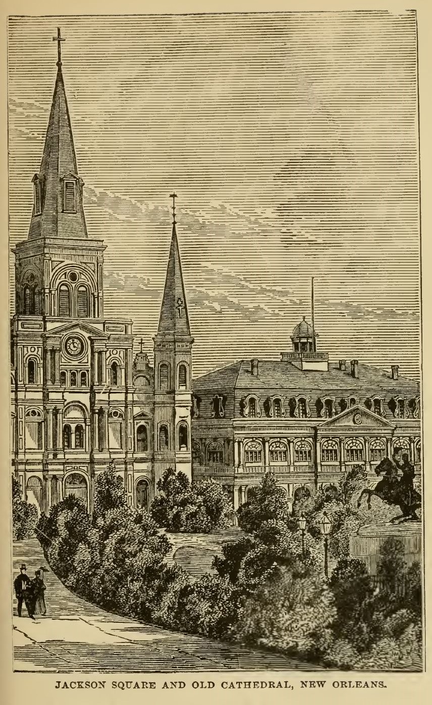New Orleans is not a handsome city, architecturally speaking, though it has a number of fine buildings. Its situation is such that it could never become imposing, under the most favorable circumstances. The Custom House, a magnificent structure, built of Quincy granite, is, next to the Capitol at Washington, the largest building in the United States. It occupies an entire square, its main front being on Canal street, the broadest and handsomest thoroughfare in the city. The Post Office occupies its basement, and is one of the most commodious in the country. The State House is located on St. Louis street, between Royal and Chartres streets, and was known, until 1874, as the St. Louis Hotel. The old dining hall is one of the most beautiful rooms in the country, and the great inner circle of the dome is richly frescoed, with allegorical scenes and busts of eminent Americans. The United States Branch Mint, at the corner of Esplanade and Decatur streets, is an imposing building, in the Ionian style. The City Hall, at the intersection of St. Charles and Lafayette streets, is the most artistic of the public buildings of the city. It is of white marble, in the Ionic style, with a wide and high flight of granite steps, leading to a beautiful portico. The old Roman Catholic Cathedral of St. Louis is the most interesting church edifice in New Orleans. It stands in Chartres street, on the east side of Jackson Square. The foundations were laid in 1793, and the building completed in 1794, by Don Andre Almonaster, perpetual regidor of the province. It was altered and enlarged in 1850. The paintings in the roof of the building are by Canova and Rossi. The old Ursuline Convent, in Conde street, a quaint and venerable building, erected in 1787, during the reign of Carlos III, by Don Andre Almonaster, is one of the most interesting relics of the early Church history of New Orleans. It is now occupied as a residence by the Bishop.