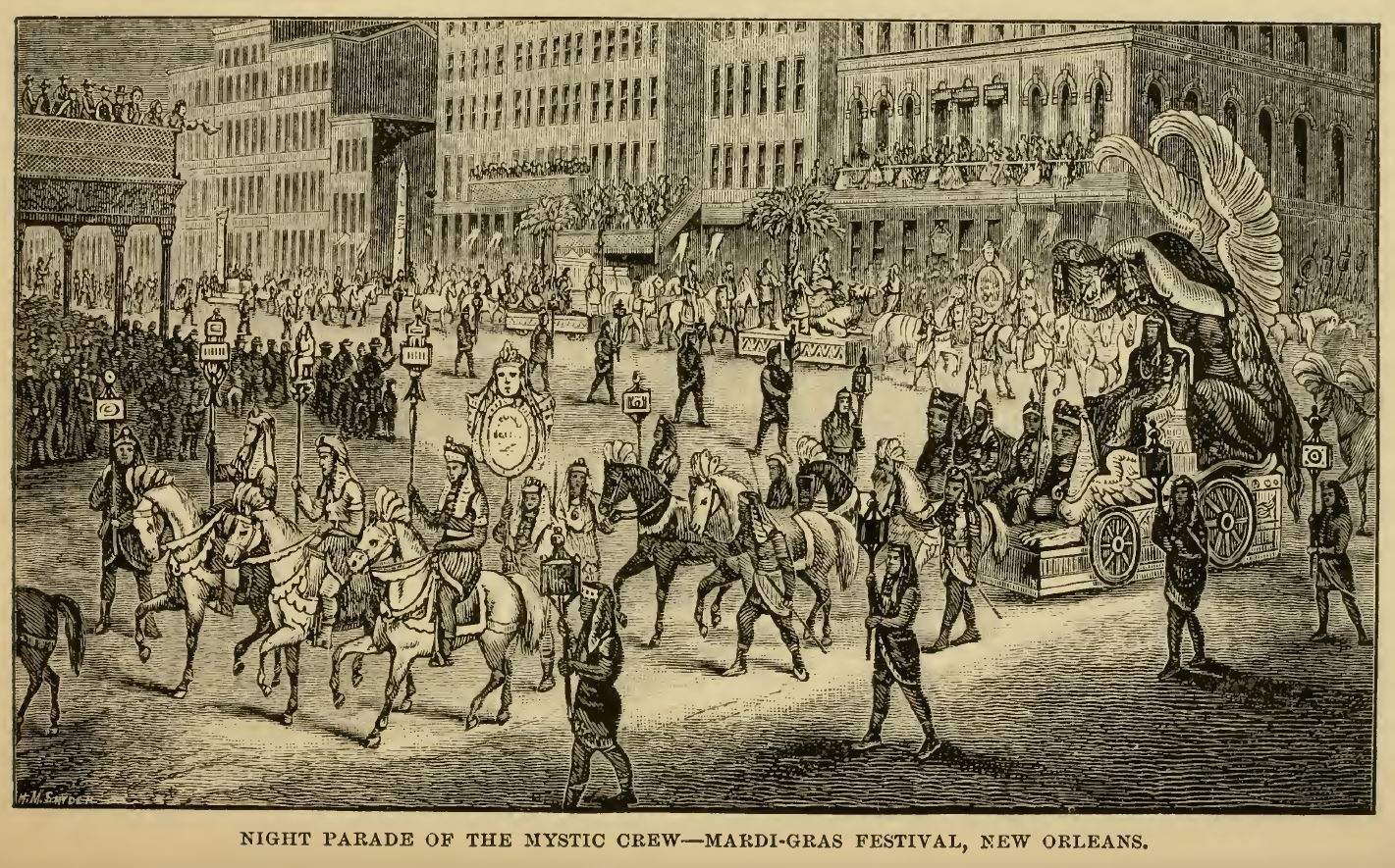 Mardi-Gras, or Shrove Tuesday, is observed in New Orleans by peculiar rites and ceremonies. Rex, King of the Carnival, takes possession of the city, and passes through the streets, accompanied by a large retinue, his staff and courtiers robed in Oriental splendor. The city gives itself up to mirth and gayety, with an abandon only paralleled by that witnessed in Italy on the same occasion; and the day is concluded by receptions, tableaux and balls.