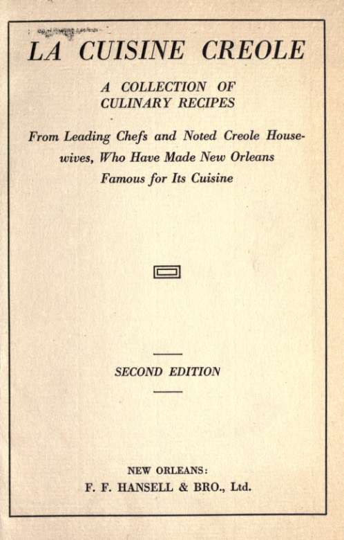 Hearn, Lafcadio. La Cuisine Creole: A Collection of Culinary Recipes. 2nd ed. New Orleans: F. F. Hansell & Bro, 1884. Web. 12 December, 2006. Internet Archive 20 May 2015. <https:// archive.org/ details/ lacuisine creolec00 hearrich>.