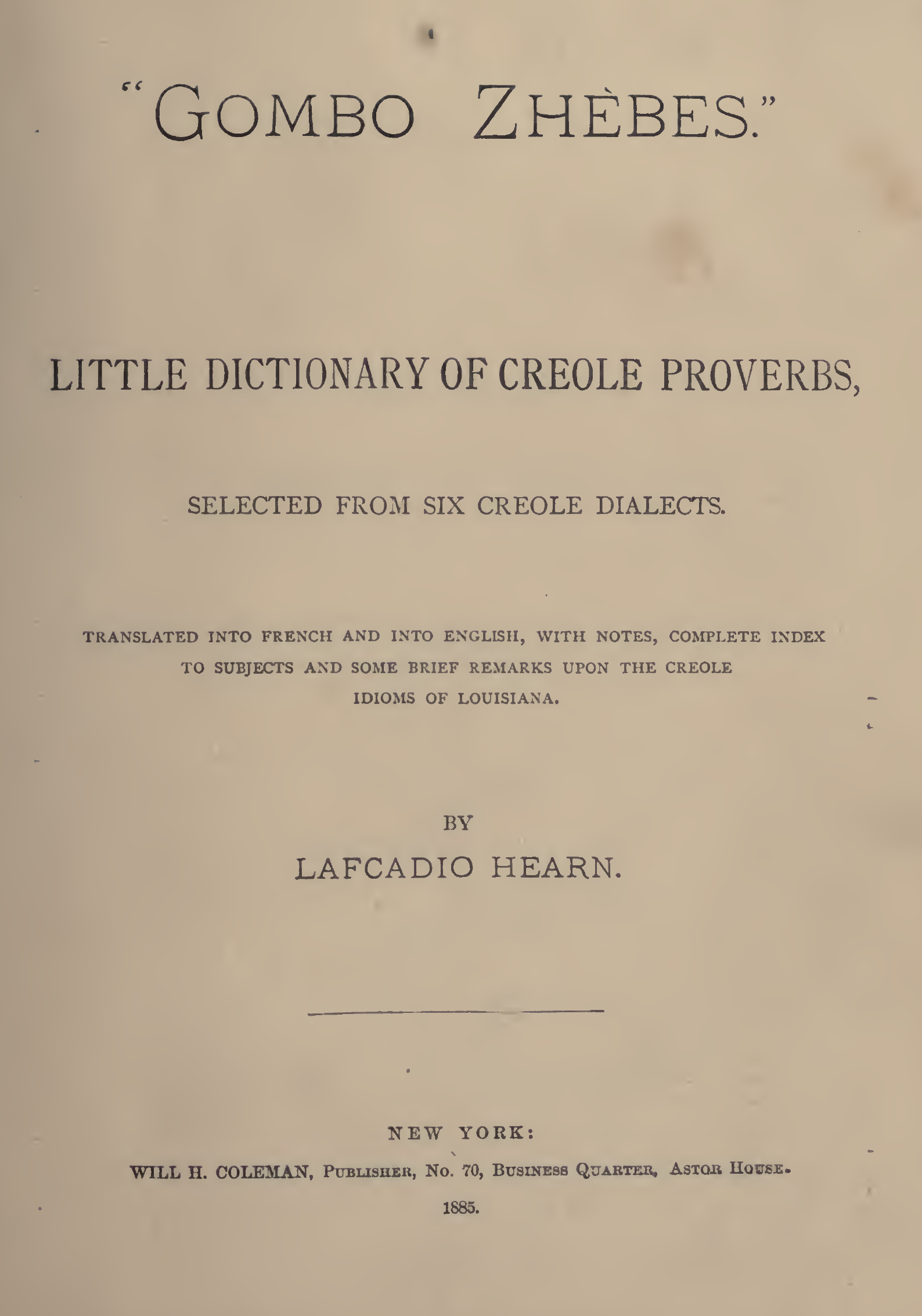Hearn, Lafcadio. “Gombo Zhèbes”: Little Dictionary of Crole Proverbs. W. H. Coleman, 1885, Internet Archive, https:// archive.org/ details/ gombo zhbes litt00 hearuoft/, Accessed 23 Nov. 2021.