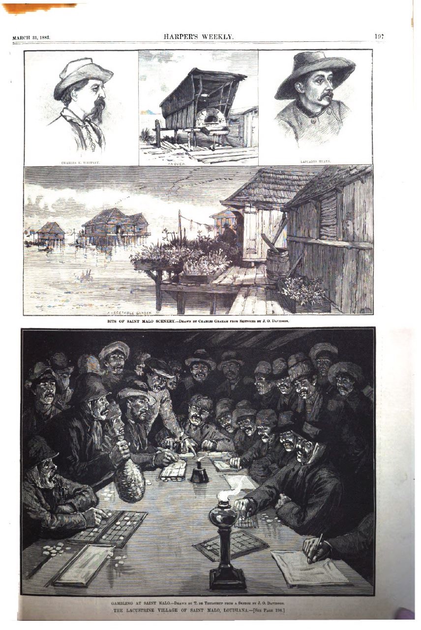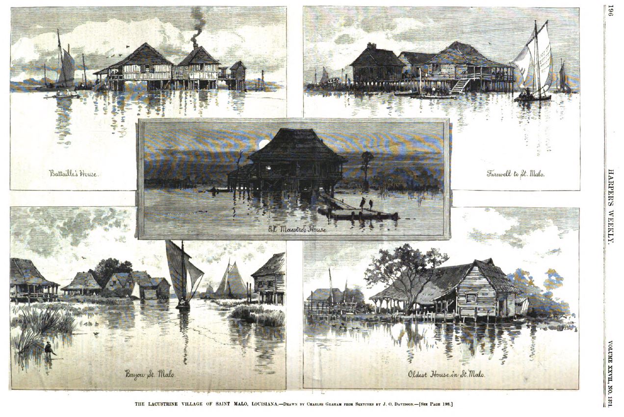 Hearn, Lafcadio. “Saint Malo. A Lacustrine Village in Louisiana.” Harper’s Weekly: A Journal of Civilization 31 Mar. 1883: 196-99. Haithi Trust. Web. 20 July 2020. <https:// babel. hathitrust. org/ cgi/pt? id=pst.000020243272 &view=1up &seq=208>.