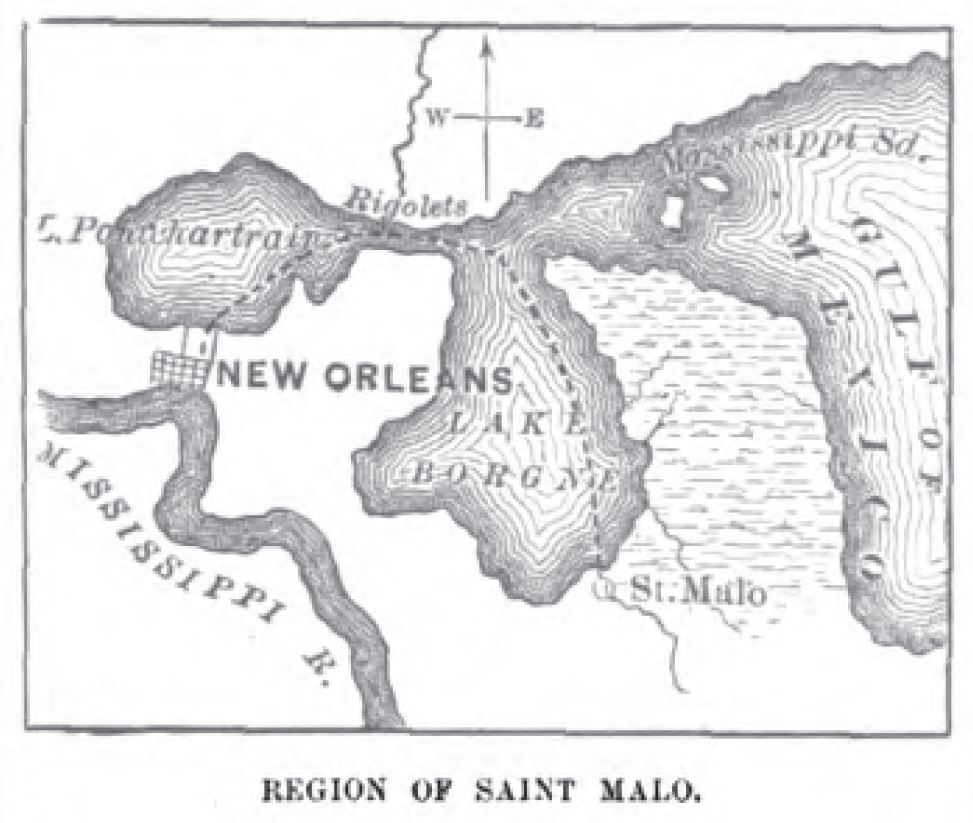 On the eastern side of the Rigolets Lake Borgne has scalloped out its grass-fringed bed in the form of a gigantic clover leaf — a shallow and treacherous sea, from which all fishing-vessels scurry in wild terror when a storm begins to darken. No lugger can live in those short chopping waves when Gulf winds are mad. To reach the Manila settlement one must steer due south until the waving bulrushes again appear, this time behind muddy shoals of immense breadth. The chart announces depths varying from six inches to three and a half feet. For a while we grope about blindly along to the banks. Suddenly the mouth of a bayou appears — “Saint Malo Pass.” With the aid of poles the vessel manages to shamble over a mud-har, and forth-with rocks in forty feet of green water. We reached Saint Mato upon a leaden-colored day, and the scenery in its gray ghastliness recalled to us the weird landscape painted with words by Edgar Poe — “Silence: a Fragment.”